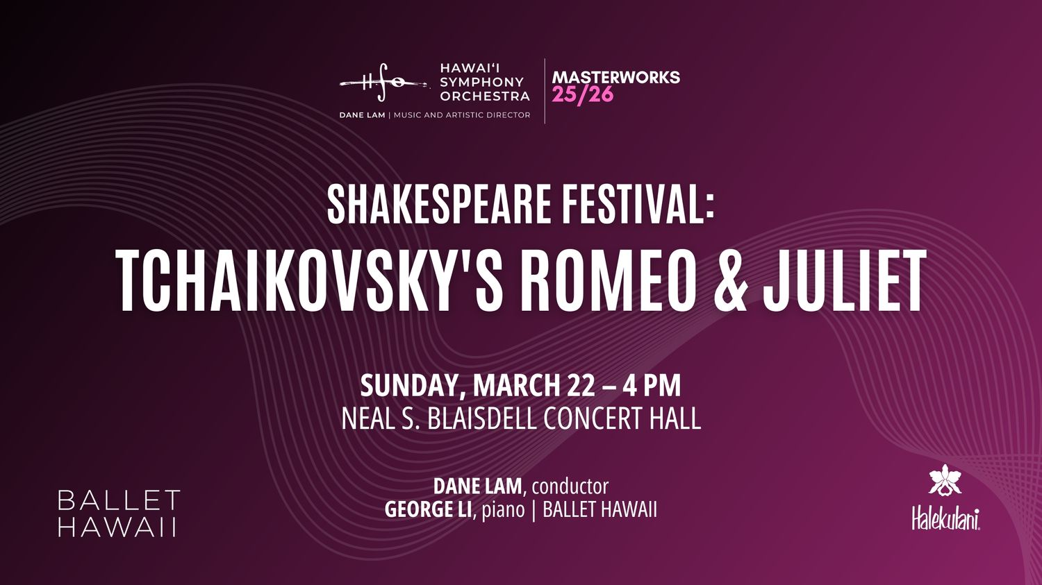 SHAKESPEARE FESTIVAL: TCHAIKOVSKY’S ROMEO & JULIET Masterworks Sunday, March 22, 2026, 4:00 PM Blaisdell Concert Hall Dane Lam, conductor George Li**, piano Ballet Hawaii Michael-Thomas FOUMAI Lady Dark TCHAIKOVSKY Romeo […]