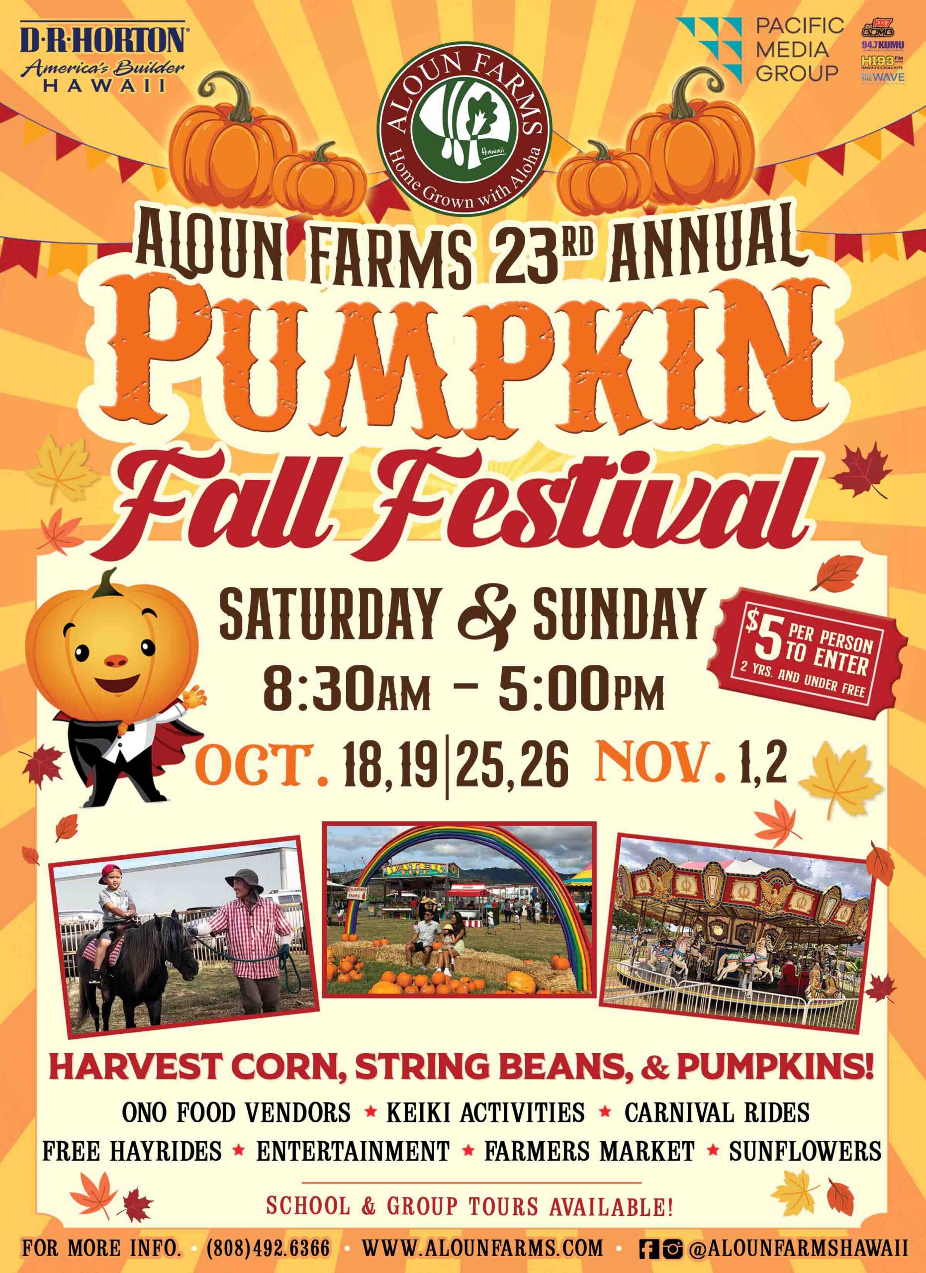 The 23rd Annual Aloun Farms Pumpkin Fall Festival will take place on the weekends of October 18-19, 25-26, and the first weekend of November, November 1-2, 2025. Admission is $5 per person, with children under two admitted free. The festival features pumpkin picking, sunflower fields, FREE tractor hayrides, carnival rides, a farmers market, and food.