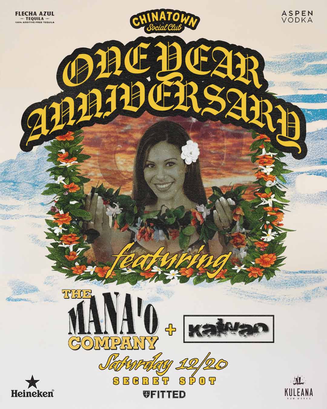 IT’S ‘CHINATOWN SOCIAL CLUB’S ONE YEAR ANNIVERSARY AND WE TROWING ONE FAT PATEH! THIS SATURDAY, AT THE SECRET SPOT IN WAIKIKI. FEATURING LIVE PERFORMANCES BY KAWAO AND THE LEGENDARY MANA’O COMPANY DOORS OPEN AT 7 COME EARLY! TICKETS ONLY $20, get yours at socialclubhi1yr.eventbrite.com HUGE THANKS TO: ASPEN VODKA, FLECHA AZUL, KULEANA RUM AND HEINEKEN.